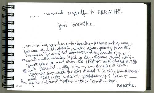 not in a hey-you-have-to-breathe-to-live kind of way, but more of a checking in, slowing down, pausing to really experience life and the moment and beauty of the world and remember to pick up the dry-cleaning, and don’t forget groceries, and when did I last get my oil changed? and I should really wash my car because it’s brown right now but under the dirt it used to be shiny black and did I make a doctor’s appointment yet about my new friend motion-sickness and…oops.