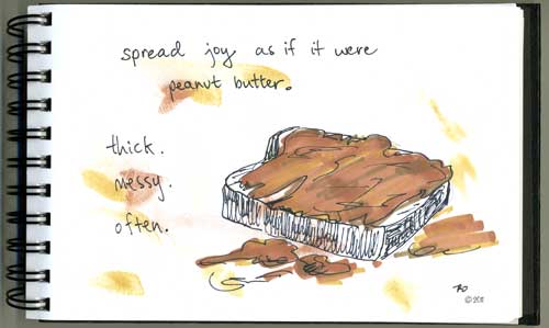 Joy Peanut Butter and Joy. by RachelJuly 5, 2011 Comments 0 If I were my own best friend I would remind myself every morning to… spread joy as if it were peanut butter. thick. messy. often. Share this: Click to share on X (Opens in new window) X Click to share on Facebook (Opens in new window) Facebook Click to email a link to a friend (Opens in new window) Email Click to share on Tumblr (Opens in new window) Tumblr Click to share on Pinterest (Opens in new window) Pinterest Like Loading... 0 comments on “Peanut Butter and Joy.” Leave a comment Cancel reply Δ Post navigation Previous Post Next Post