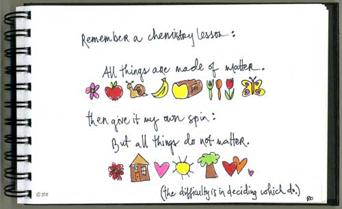 ***I love it when the lessons of science can be word-played with to have different meanings. I am almost one-hundred-percent certain that someone else has already stated this same sentiment, but after fairly extensive research I cannot find who it was. Either way I love the idea of all things being made of matter, but all things not mattering. It reminds me to focus on the things in my life that do matter: the people, the relationships, the life experiences.