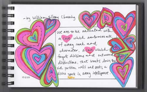 ***I love the visual nature of this quote. I love the idea of love embracing, and possibly overtaking all around it. I love the idea of love breaking through divisions and not seeing outward differences. It makes me think of colors and clams.