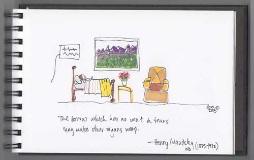 I was curious about Henry Maudsley, the gentleman who wrote the quote, so I did a quick search on him (sometimes I just love the internet). He was a British psychiatrist and apparently quite a famous and influential one. I did not find a specific reference to this quote, but if I had to guess, I suspect during his time he saw a number of patients with unexplained physical symptoms that were actually related to psychological pain. He probably recognized that if certain mental pain is left untreated the body will find a way to make it known, perhaps through a completely different organ, like the heart or lungs or gut.