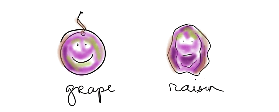 If I were my own best friend I might remind myself to check in and determine if I am feeling like a grape or a raisin? What is my energy level? What do I need that day to be my best self? I think it is okay to be a grape one day and a raisin the next. But I also think it is important to recognize what you are on each day and then act and take care of yourself accordingly. If you find you are a raisin on most days what could you do differently to be a bit more grape-y? And on the grape days, how do you recognize those people who are feeling more like raisins and give them what they need? It’s all about balance.