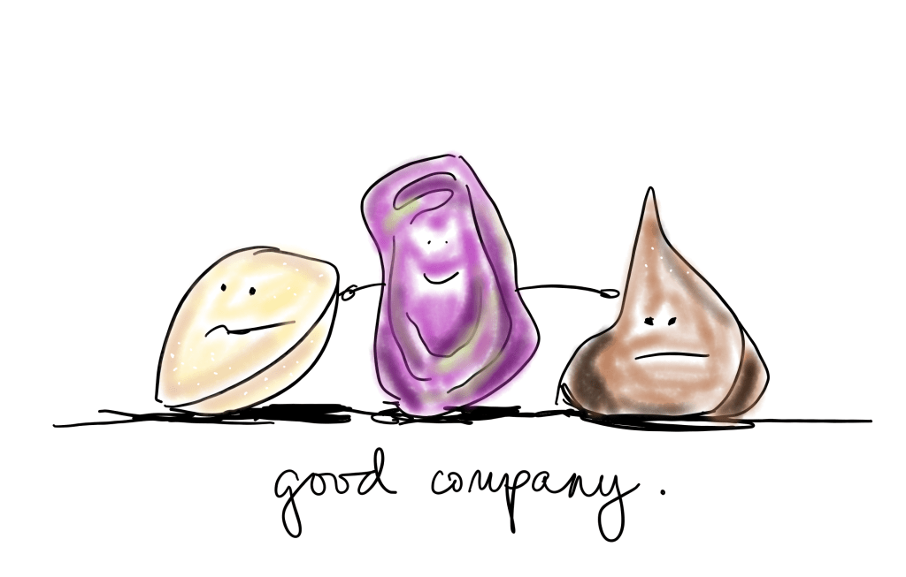 But on the raisin days, well… there is a reason most people do not put raisins in fruit salad. So what goes with raisins? Well, today I felt like a raisin. And I was surrounded by melons and cherries and berries. Finally I found a peanut – a little crunchy and cranky and salty. A good compliment to my raisin-self. And then I found a chunk of dark chocolate – a little bitter and sweet but smooth. Trail mix. It is very reassuring on the raisin days to have a few people in your court who are a little bit crunchy and salty and bitter and sweet. It’s all about balance.