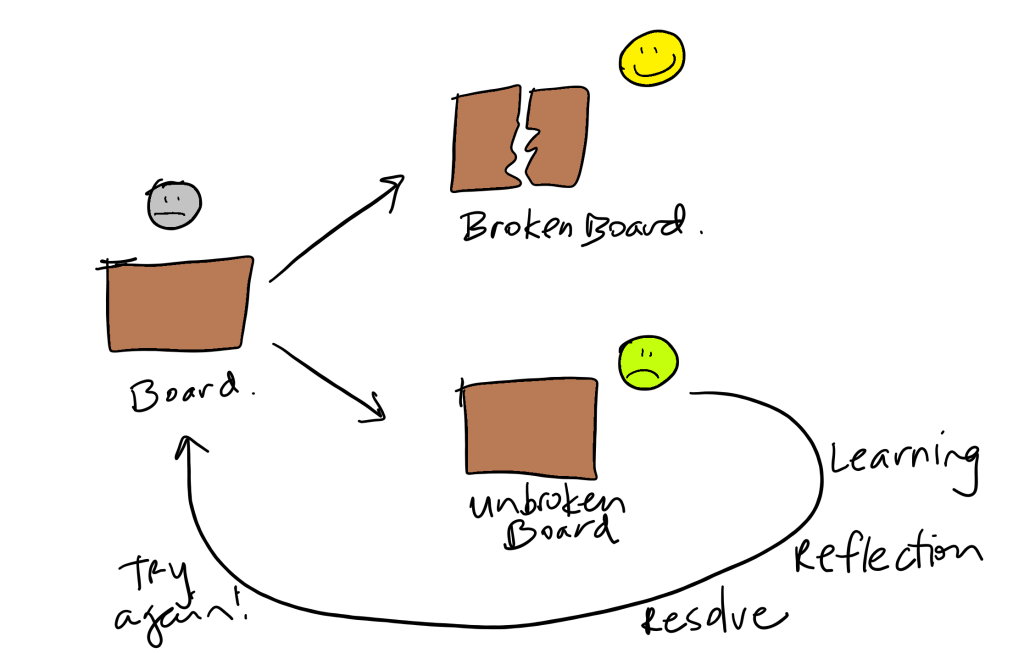But if you break the board after failing I know something more about you. I know you failed in front of everyone. I know you had to find the strength to stand back up in front of all those people. I know you had to take a chance and find the will to try again. And I know you persevered because you broke the board, despite failing the first time.