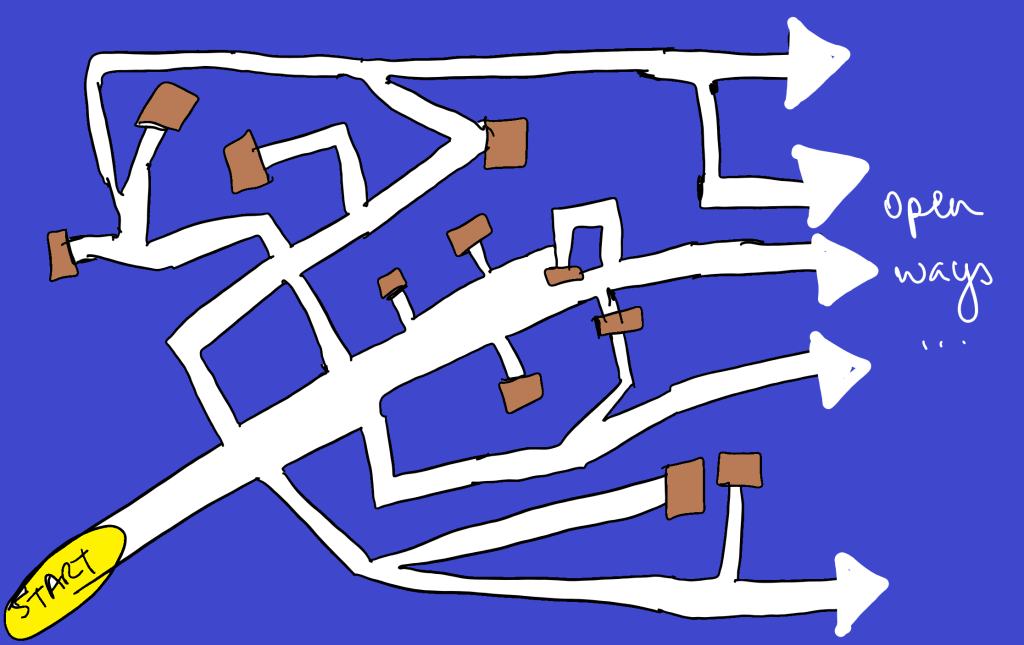 I have just started to scratch the surface but what caught my attention was the idea of not just finding one’s way, but closing off ways to allow a new way to be found.