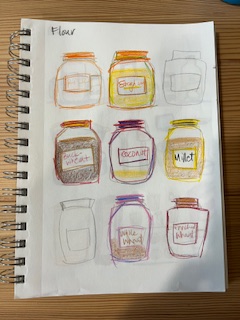 Since being diagnosed with celiac disease a few years ago, I’ve discovered many new flours. I could fill an entire pantry with flours – different colors, textures, tastes. And I could fill an entire kitchen with all my failed gluten-free baking experiments. It’s gotten better over the years. Less hockey puck. Less smoosh. Less odd flavor, vaguely reminiscent of beans. Less crumbly. I suspect I’ll always miss “gluteny” baked goods. But at least I can fill a pantry with interesting flours now. And I can draw them.